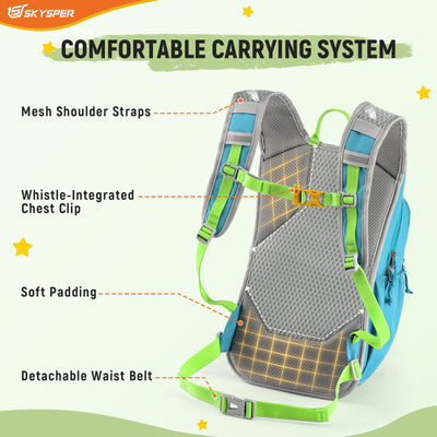 • Ergonomic System: Our kids hiking daypack features breathable mesh shoulder straps and a soft back panel that help distribute weight evenly and prevent discomfort. The chest strap and waist belt are adjustable to fit a child's body perfectly, ensuring all-day comfort during their adventures