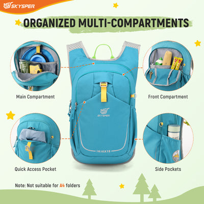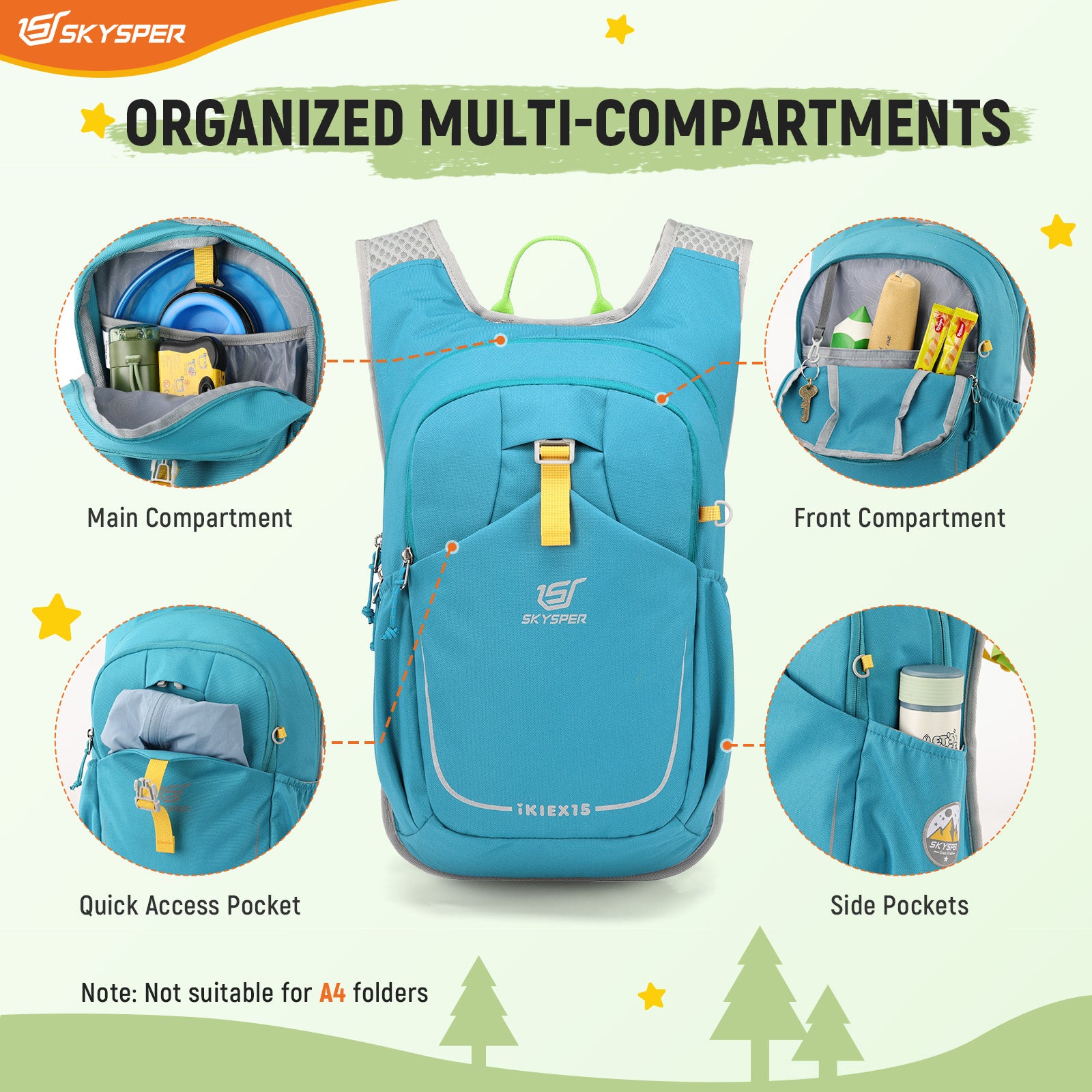 • Multi-Compartments: Our 15 liter kid backpack is perfectly sized for daily necessities without feeling overloaded. It featurs a spacious main compartment with a sleeve for hydration, a front compartment for smaller items, and a quick-access pocket for extra clothes or towels (hydration bladder not inclued)